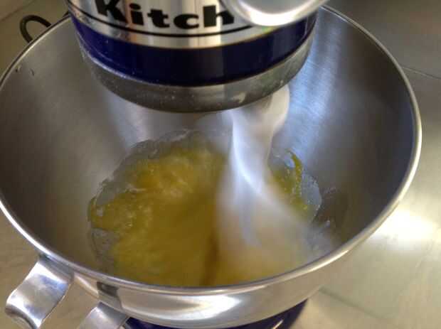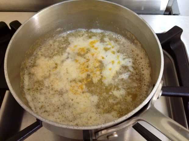 En un cazo... reduzca la mantequilla a baja temperatura hasta que se disuelva, añadir el limón, el azúcar de limón, vainilla, extracto de anís.
