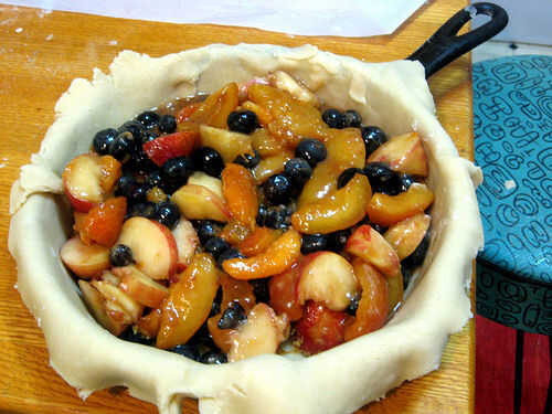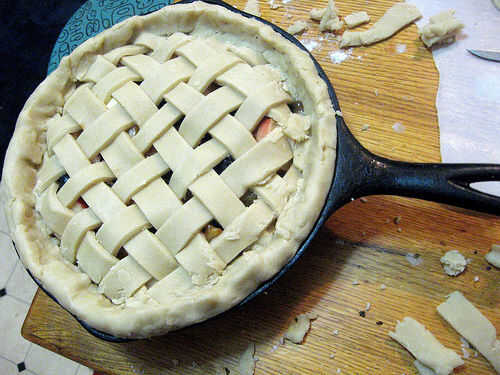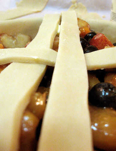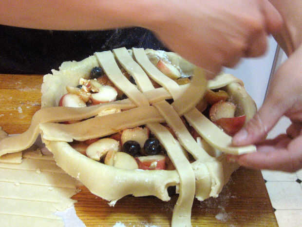 Volver a en masa que hemos preparado para el enrejado superior. Cortar la masa en tiras. Comenzar a tejer tapa de enrejado, tomando tu stips de masa y alternando arriba y abajo sus otras tiras. Tenga cuidado al manipular la masa tiras que puede tener una tendencia de rasgado aparte. Si la tira se rompe, sólo mójela abajo y apriete nuevamente juntos. Utilice las tiras largas en el centro de las tiras más cortas de pieand hacia los bordes.