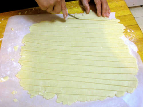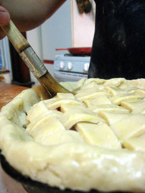 Para preparar los bordes de la parte inferior corteza al presionarse con la masa de enrejado, cepillo yema (separada de la clara de huevo) alrededor de los bordes antes de empezar a colocar el entramado tiras hacia abajo.