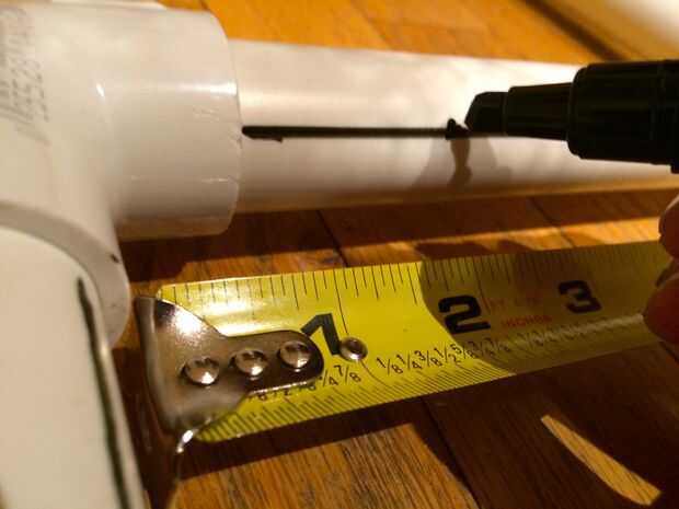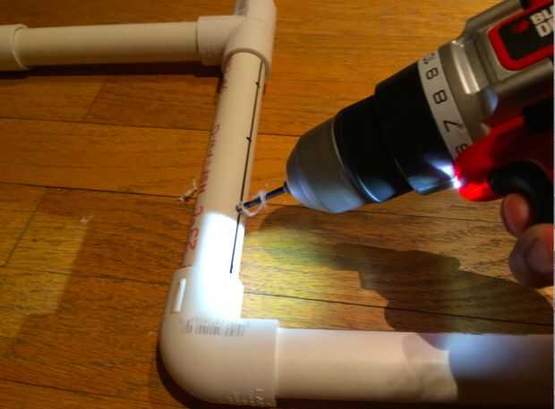 Hacer una línea recta en cada una de las piezas de pvc con un seco borra el marcador y hacer líneas 2" separados a lo largo de la línea. Utilice una 1/8 broca para taladrar los agujeros. Una vez hecho esto, gire los agujeros para el centro.