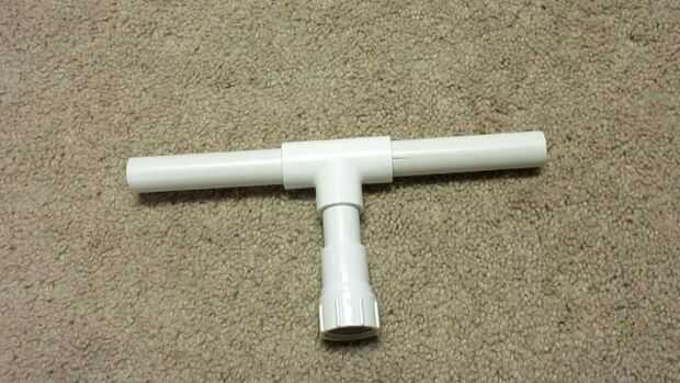 A continuación, añadir los tubos de 4 pulgadas a los lados del conector en T y el tubo de 2 pulgadas en la parte inferior. El adaptador de la manguera se conecta a la tubería de 2 pulgadas.