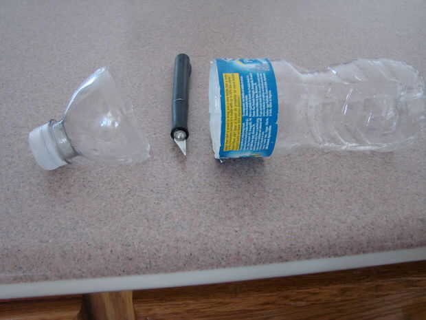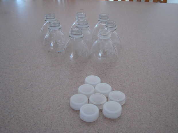 Utilizar el cuchillo o exacto para cortar alrededor de la botella entera, justo por encima de la línea de la etiqueta. Hacerlo con el resto de las botellas hasta que tenga ocho tapas. Tirar o reutilizar los fondos de botella en otro instructivo. Mismo para las tapas, pero asegúrese de mantener al menos uno de ellos! quedará con ocho tapas de botella y una tapa.