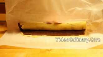 Coloque la masa de chocolate encima de la masa de vainilla y presione suavemente para sellar juntas. Rodar un pequeño trozo de la masa de vainilla en un cilindro, de la misma longitud que la vainilla y la masa de chocolate. Coloque el lado largo y enrolle la masa en un cilindro apretado con papel pergamino. Envolver bien en papel de pergamino y refrigere hasta que esté firme lo suficiente como para cortar.