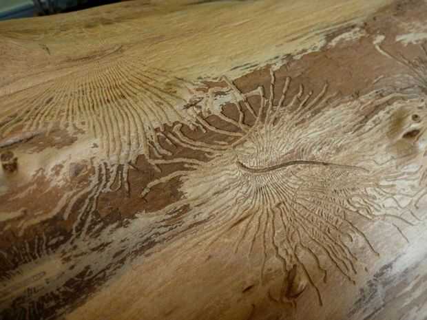 La historia de la reproducción del escarabajo de la corteza se deja atrás el inconfundible patrón en la superficie de la madera que se muestra a continuación. El escarabajo primero madriguera a través de la corteza y en la carne exterior del árbol para crear la línea oscura. Luego pone sus larvas a lo largo de esa madriguera. Cuando el las larvas eclosionan, los escarabajos bebé cavaron y comen su camino a través de la carne del árbol para escapar, causando el encendedor de líneas que irradian de los centrales oscuros.