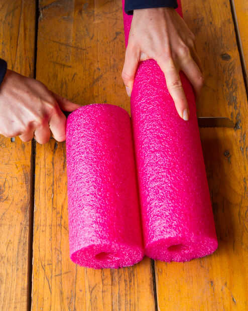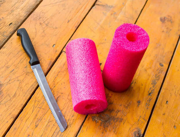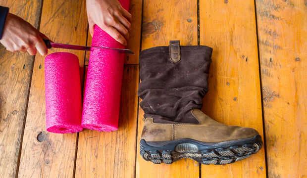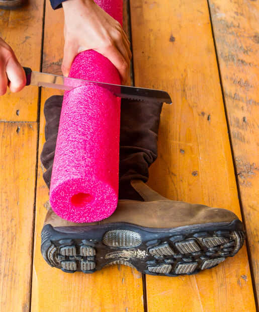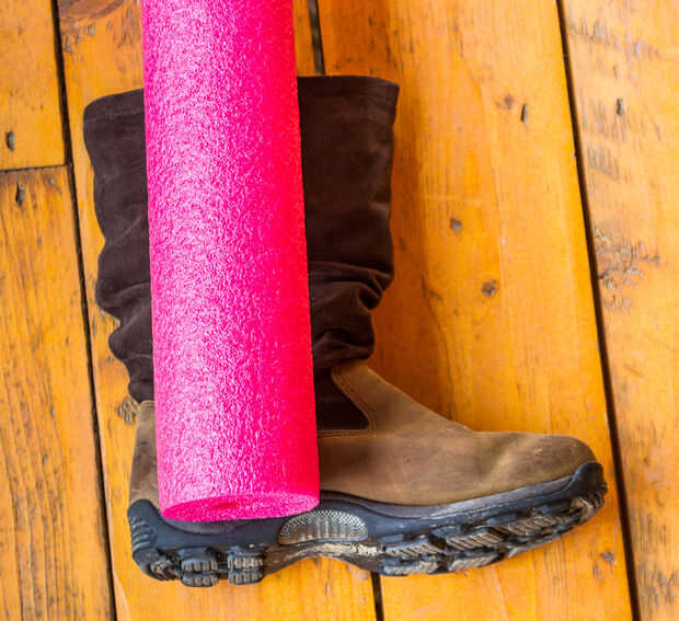 Lo primero es lo primero - queremos utilizar la piscina tallarines (o papel toalla rollo si tienes a mano en lugar de otro) para hacer la bota becerro de pie sobre su propia. Se necesita cortar los tallarines de la piscina a la longitud específica de su bota. Esto es bastante sencillo, pero hay algunas cosas de menor importancia a considerar. Por ejemplo, los tallarines de la piscina no saldrá probablemente hasta la suela de la bota (no mía), y por lo que necesitará cortar más corto entonces piensas.