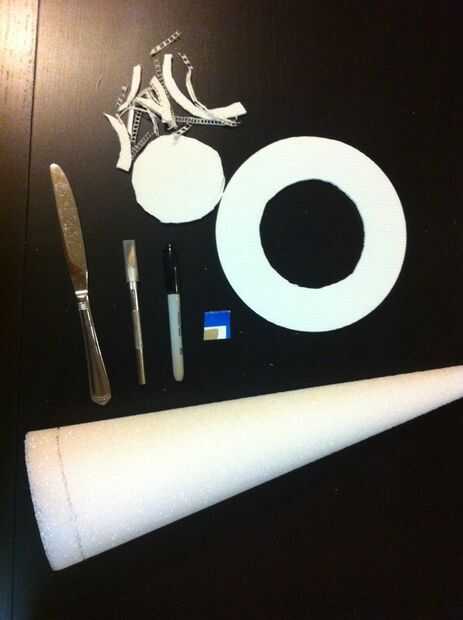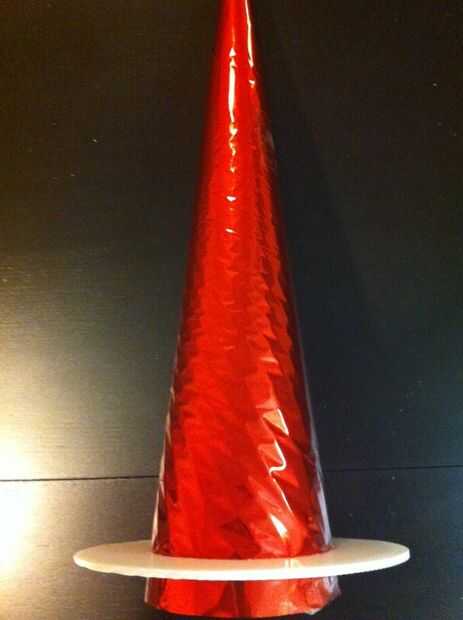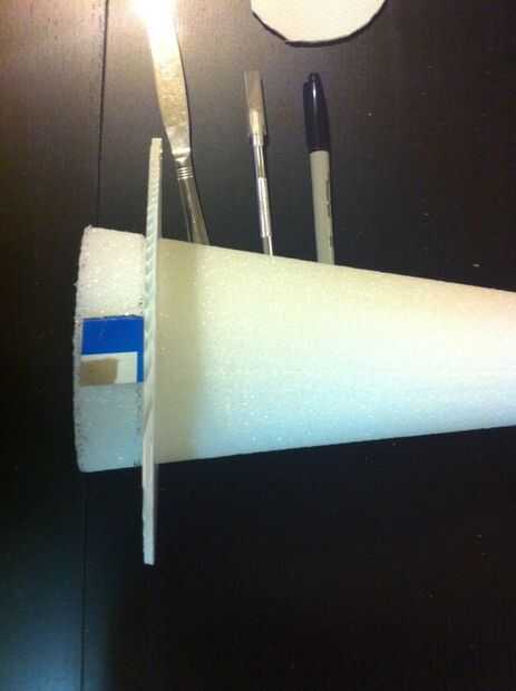 Desde la parte inferior de la base de la torta, anotar el cono de espuma con un cuchillo de mantequilla para hacer una ranura poco profunda en el cono entero. Tenga cuidado de mantener la ranura justo debajo de la base de la torta. La base de la torta se instalarán en esta ranura más adelante en este paso hacer la base extra resistente.