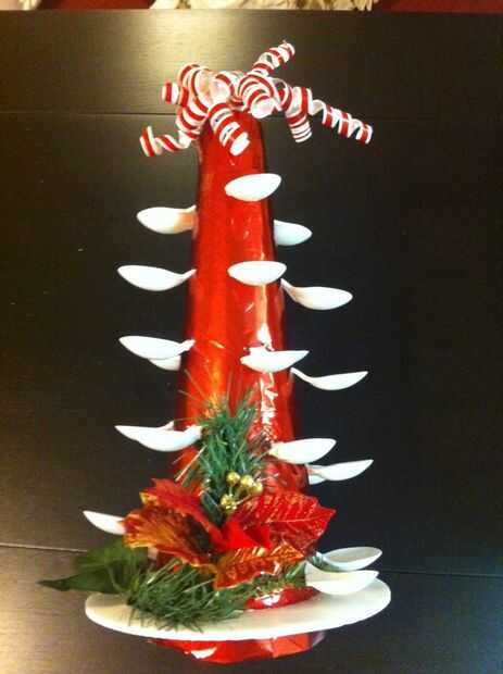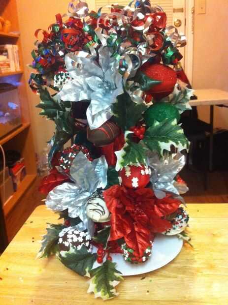 Coloque un arco de la cinta en la parte superior de las ramas de árbol y empuje de garland en los espacios vacíos entre las pelotas de la torta.