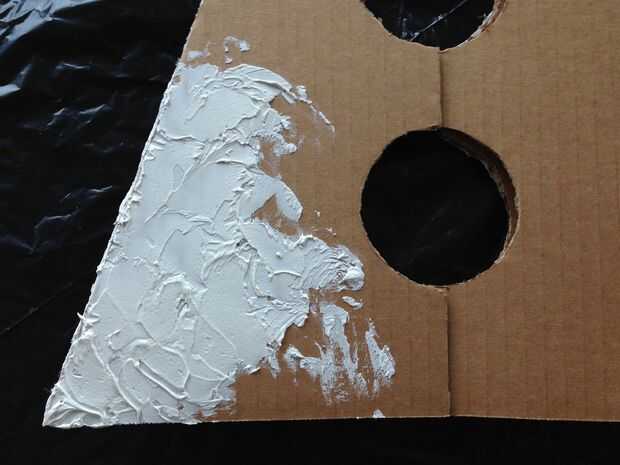 El cartón, incluyendo los bordes, con nieve-Tex usando un cuchillo de plástico para untar la pasta en la cubierta. Utilice el lado plano para añadir textura al levantar el cuchillo hacia arriba y hacia abajo y agitando alrededor.