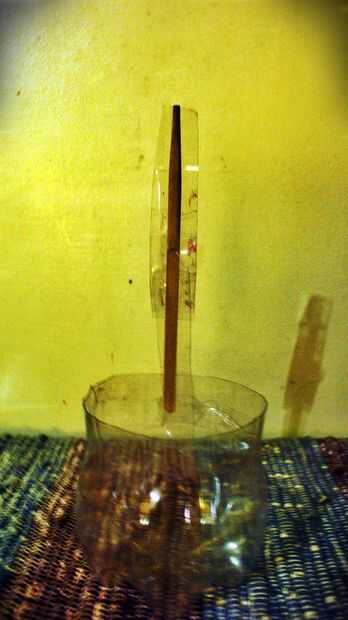 1. Corte la botella de plástico dejando la parte inferior y la parte posterior. 2. forme el tronco. 3. cinta el palillo de barbacoa en el tronco formado por lo que no será flexible. 4. envolver el tronco con el papel marrón del arte.
