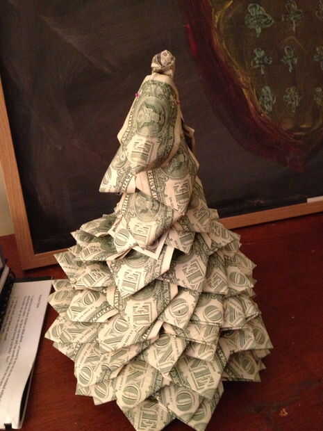Se hace de clavijas de empuje, un cono de espuma de poliestireno y muchos billetes de un dólar ($1) a la forma de un abeto.