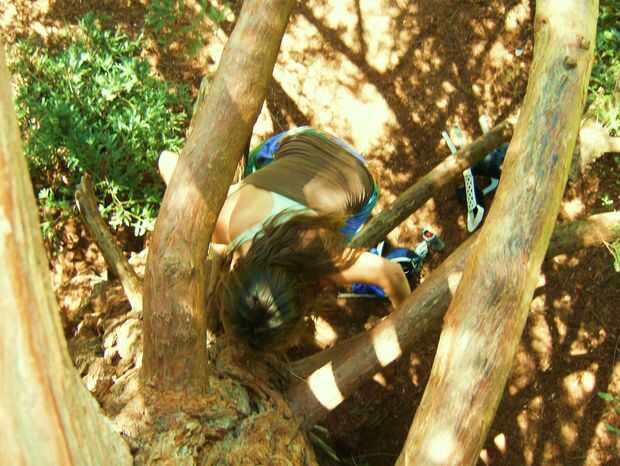 Obtener un buen agarre con las manos en algo o otro y luego encontrar un lugar para poner los pies. Como subiendo peso de transferencia de rama a rama. Bajando debería ser más fácil porque usted habrá trazado una buena ruta en el camino. No olvide asegurarse de que su pie/puño es constante antes de transferir el peso.