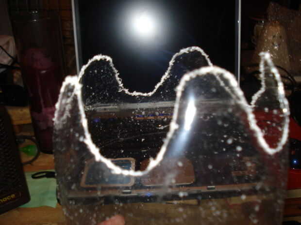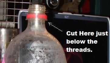 Con cuidado, corte la parte superior de la botella, justo por debajo de los hilos. A continuación, utilice la herramienta Dremel, corte el fondo siguiendo el contorno de la botella.