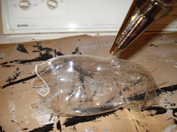 Usando la pistola de calor, comienza a calentar el plástico hasta que empieza a encoger - se va a reducir mucho. Como lo hace, las piezas de la parte inferior de la botella se van a querer rizar. Mina quería rizo bajo así que mientras que el plástico era todavía flexible, se tira de ellas hacia afuera para imitar a las raíces. Una vez que las raíces la forma en que desee buscar, vertical la botella para asegurarse de que encuentra a nivel. También asegúrese de que la abertura superior del plástico es todavía lo suficientemente amplia como para la parte superior de la vela ventana quepa.