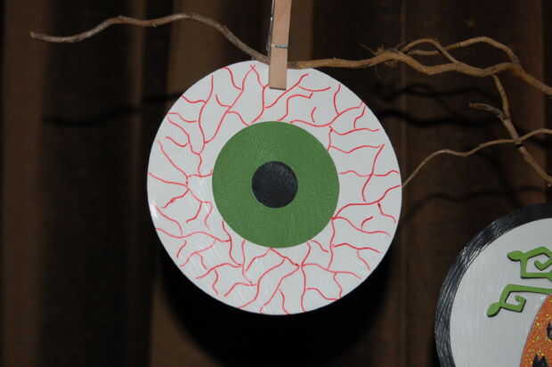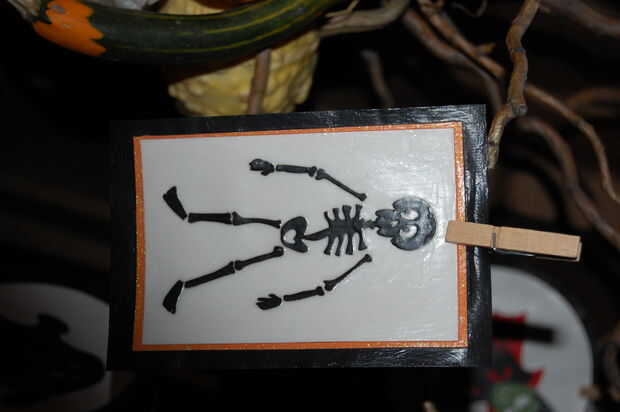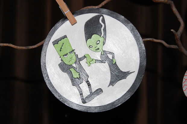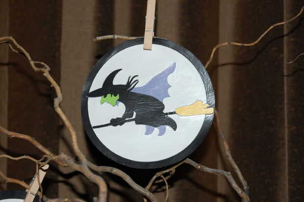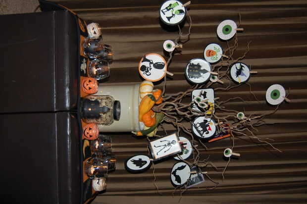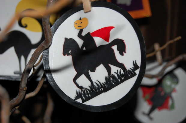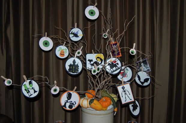--Utilizar cartucho de Cricut de Halloween, y recorte de varias criaturas diferentes con textura de papel. Utiliza modge podge pegar formas de fondo de una estera, y luego una forma más grande para un marco. Utiliza modge podge en el frente para hacer un bonito acabado mate en cada ornamento. Una vez seco, usé modge podge en la parte posterior de cada adorno. Cuando esté seco, coloqué entre libros pesados para aplanar los ornamentos. Alfileres ropa pequeños fueron utilizados para sostener adornos en las ramas de los árboles.