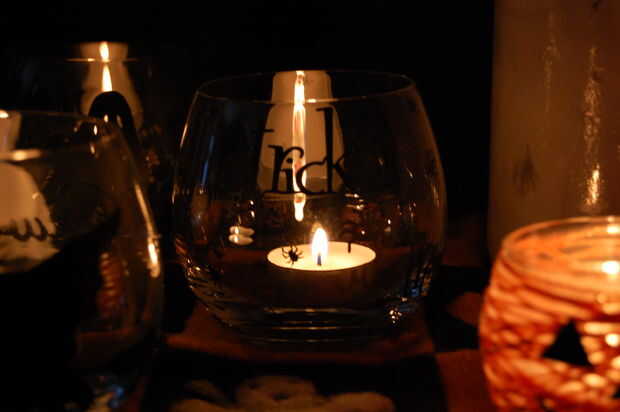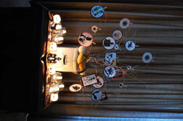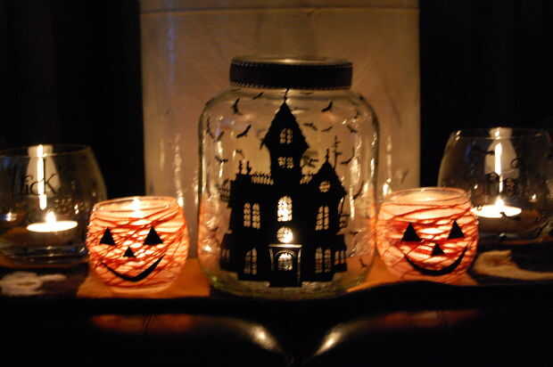 --Velas fueron hechas de frascos de vidrio y cristales en el fondo de comercio. Usé la Cricut para recortar imágenes de Halloween adhesivo de vinilo negro. Les pegan en los vidrios. Tarro de pickel gran acabado con un lazo blanco y negro. Las arañas y los murciélagos pequeños hacen sombras en la pared detrás de ellos cuando se encienden velas.