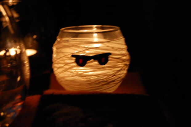 -Pequeñas velas gato-o-linterna y mamá se hicieron con seda del bordado en almidón líquido. Recortar caras utilizando cricut y utiliza modge podge para pegarlos en las velas.