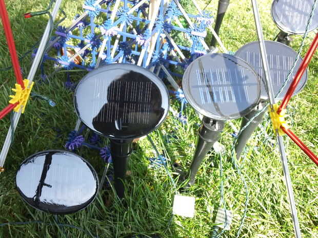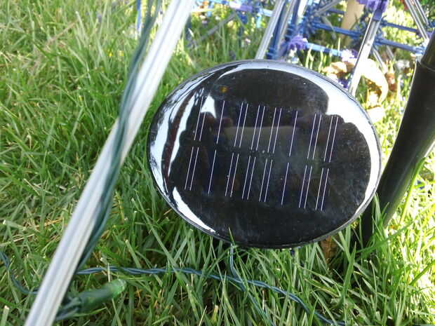 Tengo 6 cajas de solares powered luces en Rite Aid para $15. Carga durante el día y la luz en la noche. Tienen sistemas con multicolor LEDs o LEDs blancos. Cada caja viene con una estaca, una extensión para el juego, un clip, un panel solar y una cadena de LEDs. Los LEDs en los orificios de 1/4 de pulgada en KVG conectores. Recomiendo poner los paneles solares fuera, va a funcionar mejor.