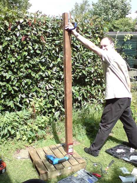 Un poco de plataforma boca abajo en el piso y el otro en la parte superior. Asegúrese de orientar la superficie para crear dos túneles. Esto es donde vas a deslizar el lastre de más adelante. Siguiente línea donde desea el apoyo de poste de cerca para ir. Asegúrese de que se superponga dos trozos diferentes de madera como el estrés de las bicicletas puede ser demasiado para un pedacito de madera. También ponemos algunos tornillos adicionales en la superficie del techo para reforzarlo. Con las bicicletas colgadas de la parte frontal del poste de la cerca, va a ser muy centrada en el apoyo de la fuerza, así que es agradable y apretado.