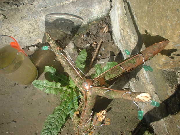 En la parte inferior de la de la madera, terminales fueron moda de cobre "clavijas" insertadas en agujeros perforados. El cobre fue cortado desde el cable de red a ~1/4"y fricción.