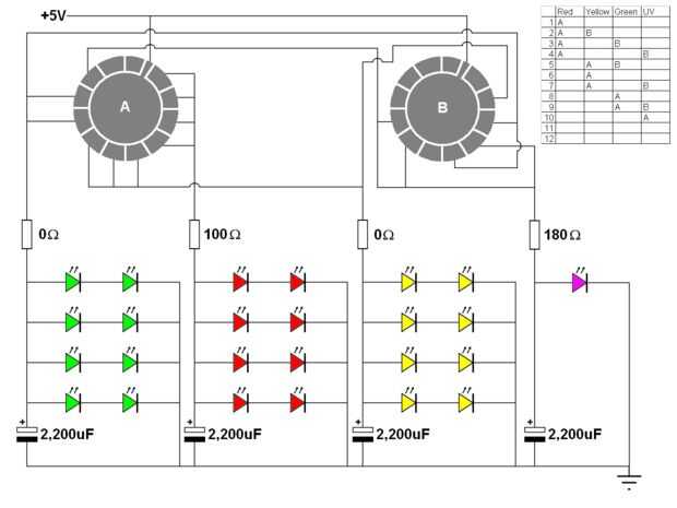 Los LEDs verdes y amarillo se originalmente restringidos con resistencias de 39 Ohm, pero eran un poco poder estadístico suficiente, por lo que estos fueron removidos. Por esta razón existen resistencias de 0 ohmios en el esquema.