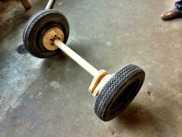 Este montaje de rueda post apocalíptico utiliza un eje de madera y repuestos neumáticos (donuts) para proporcionar la base para una carretilla de mano, carro simple o remolque. Corto de metal y herramientas, también es una reparación perfecta para un remolque roto. Después de que hice, me di cuenta de que un eje sólido tiene algunos problemas para encender, por lo que recomiendo realmente cortar el árbol por la mitad y colocar cada rueda independientemente, por lo que un arreglo de dos ruedas pueda girar.