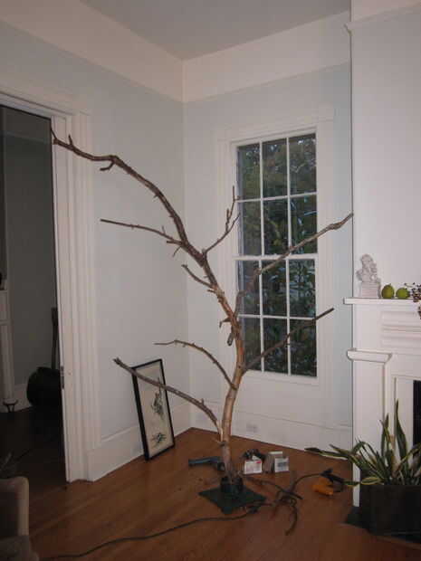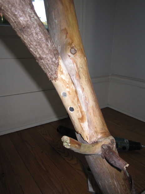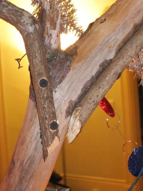 Después de montar la cañería "tronco" es hora de añadir las ramas. Aquí está donde entran los ojos extras para jugar. Comienzo con la más grande una persona mueve la rama hacia arriba y abajo o alrededor del "tronco" hasta el ok de los ojos extras. No tenga miedo de cambiar ramas si no puede hacer que funcione. Puede que necesite hacer un corte en el extremo de la rama por lo que será fácil atar, o puede pasar Compro la parte de atrás y atorníllelo de esa manera. Usé un poco de avellanado para que la madera no se dividiría.