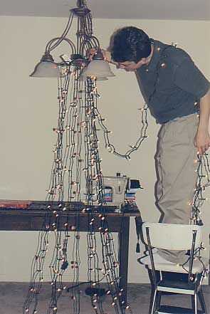 La premisa básica es simple; las luces de Navidad en forma de un árbol desde de un punto arriba de la secuencia, enchufe y decorar. Las imágenes que vemos aquí fueron desde el primer árbol árbol-menos hicimos. Opté por la lámpara en el comedor y encadenan las luces a través de enchufar un adaptador que incorpora una toma de corriente al enchufe de la luz. Se puede colgar de cualquier cosa que soportan el peso y enchufe donde sea conveniente. Una lámpara de pared, de una viga.