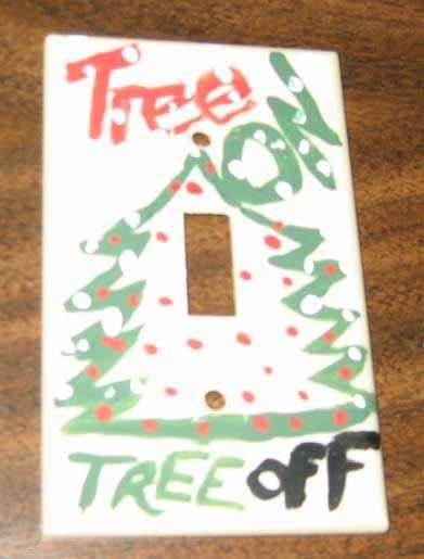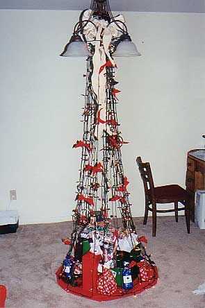 Esta es la parte mejor, y lo dejo sobre todo a usted. Simplemente colgamos nuestros adornos de las secuencias de luces por meter los ganchos a través de los cables trenzados. Hemos hecho toneladas de variaciones sobre cómo y qué conectar a la luz, dependiendo de lo que se cuelga del árbol de, cómo grande o pequeña, estrecha o amplia, alto o corto, etc.. Ha sido casi tan divertido como un árbol de verdad, pero sin cortar un árbol vivo, no pagar, no hay lío de la aguja, no acarreando un árbol casa y deshacerse de él más adelante. Para ahorrar espacio en nuestro apartamento ese año pusimos los regalos en el árbol y apiladas, que hizo una impresionante torre iluminada de regalos. Después de Navidad simplemente desmontar todo, embalar para arriba y guardar para el próximo año. Costo para nosotros fue de $ cero. También pintamos una la el interruptor de la luz para placas que apartamento ha tomado con nosotros desde entonces y conectado al interruptor que enciende el árbol y, cada año desde.