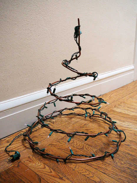 a partir de la parte superior, envuelva una longitud de luces de Navidad alrededor del cable, asegurándose de que el enchufe está en la parte inferior.  Si tienes dificultad con las luces de giro mientras esté, el extremo superior de la cinta hasta el embalaje final y quite el final.