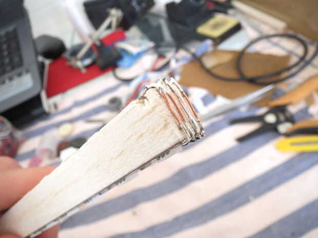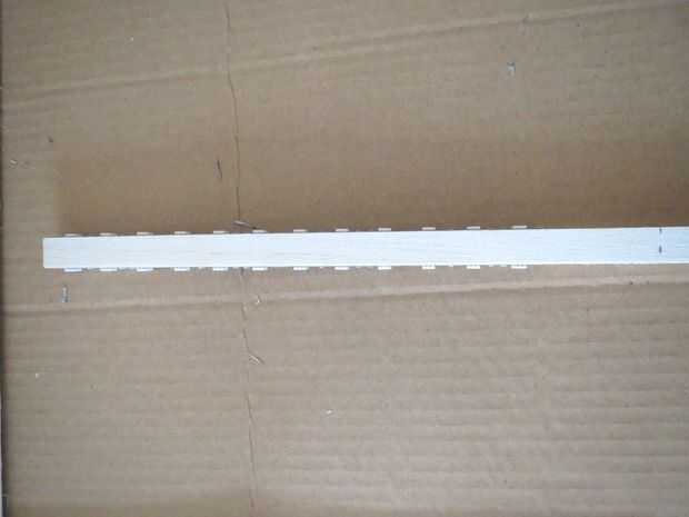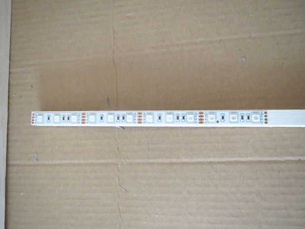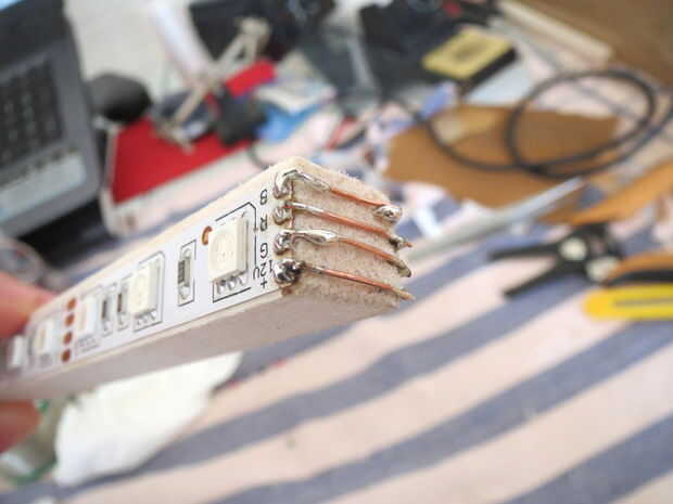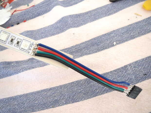 En primer lugar, cortar un haz de 21 cm de largo y pintarlo con pintura acrílica blanco u otro color que te gusta. El rayo tiene forma de cuadrado de 1 cm X 1 cm para que la tira de LED se adapta perfectamente en él. Cortar dos tiras de LED 20 cm largo y pégalos en los dos lados de la viga. La cadena de dos tendrá un lado contactos exactamente en la parte superior de la viga y asegúrese de que los contactos del LED de las dos bandas son speculars (+ 12 v, R, G, B singnals están en la misma línea). Si lo has hecho correctamente debería poder conectar las dos cadenas entre sí por cuatro alambres en la parte superior de la viga de la soldadura (ver foto). Las dos tiras de LED están ahora conectadas como una única tira más. Por último, elegir un lado de la tira y cuatro cables de los contactos en la parte inferior a un jefe del pin de la soldadura. Por supuesto, eres libre de cambiar el tipo de conexión según los cambios en el tablero de electrinic (ver siguiente paso).