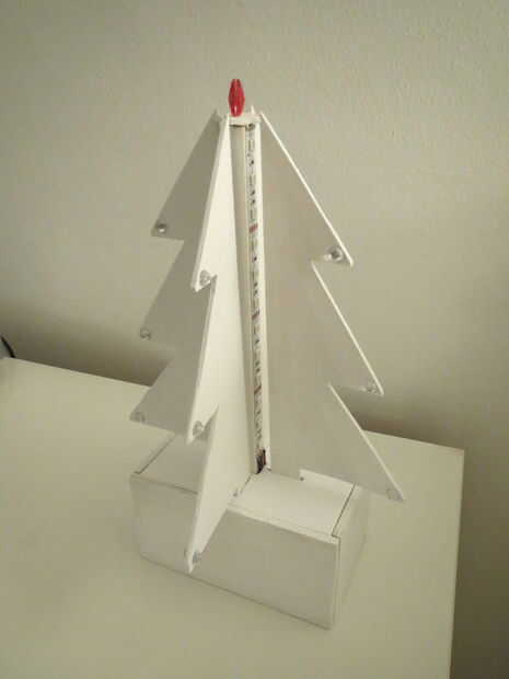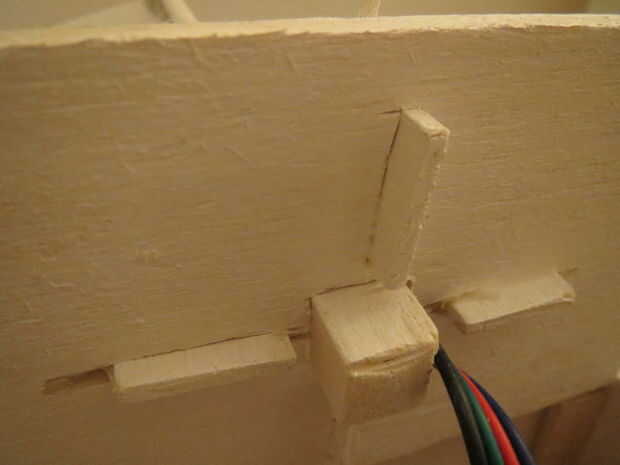 Una vez que todo se seca y lo electrónico está listo, puede mover a la etapa final. Inserte el rayo y las piezas de cuatro árboles en forma de en la parte correspondiente en el panel superior. Pegar debajo del panel y espera para el secado. Tenga cuidado de pasar los cables de la tira de LED por el agujero cuadrado. Tome la pequeña plaza de 2 cm de ancho y pégala encima de la viga por encima de los cables. Usted puede poner pegamento caliente antes si lo prefiere.