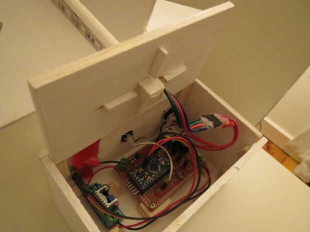 Monte la placa electrónica dentro de la caja y pegar el último panel con el botón. Espere hasta que el pegamento se seque. Cortar cuatro trozos de madera y pegar 0,4 cm desde el borde superior dentro de dos paneles (ver foto).