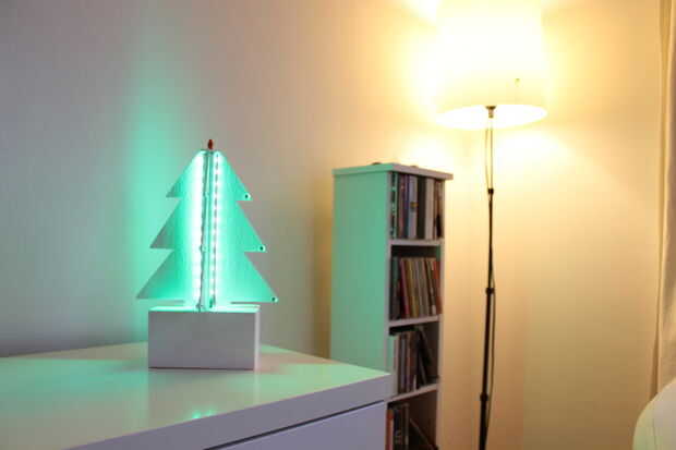 Finalmente, conecte los cables de la tira de LED a la tarjeta electrónica y la ranura del panel con el árbol encima de la caja. El panel se ajuste dentro de la caja y colocarlos sobre las cuatro piezas de madera.