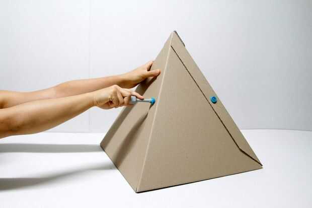 Cada módulo utiliza cuatro paneles de triángulo idéntico. Coloque la tapa de un triángulo sobre el borde de la segunda y alinee los orificios. Atornille en su lugar utilizando herramientas de construcción con cartón de Makedo.