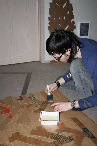 Con su cepillo, aplique liberalmente wheatpaste (u otro pegamento) a ambos lados de los árboles va pegar. Usted estará haciendo dos componentes, cada uno siendo dos capas gruesas. Junte el cartón pegado y cubrirla con algo pesado y plano. Usé el estante intermedio de mi mesa de centro, con libros de mesa de centro y un gato. Dejar secar durante la noche.
