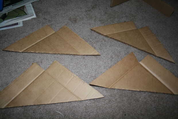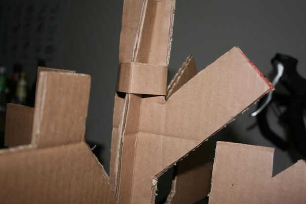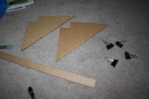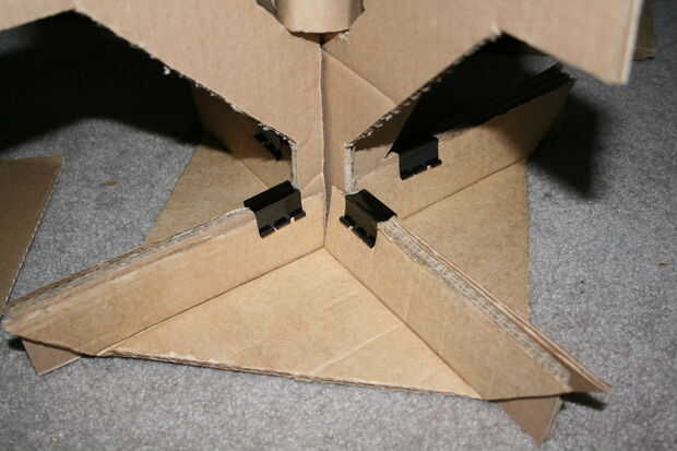 Deslice los componentes juntos, y usted tendrá un árbol de cartón muy tambaleante. Hay varias maneras que podrían apoyar el árbol y varios materiales que se pueden utilizar. Para mi árbol, quería seguir con como mucho papel como sea posible y yo quería tener un árbol que podría almacenarse plana, así que opté por apoyar con cartón y algunos clips de la carpeta. Para ello, cortar cuatro triángulos de la derecha de su desecho de cartón, con los bordes cuadrados siendo acerca de la longitud de la base del árbol. Luego, cortar un cuadrado en el punto de los triángulos (ver fotos). Puntuación y doblar los bordes hacia arriba, para que el triángulo se sentará en el piso (o mesa) y los bordes del sujeta-van a quedar al ras con el árbol. Usando clips binder, coloque los refuerzos triangulares en la base del árbol como en la imagen. También puede apoyar el tronco del árbol por recorte una tira de cartón para unir cosas. Después de que mi árbol fue apoyado, saqué los pasadores de los ganchos de la carpeta para una apariencia más elegante.