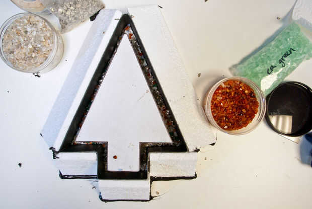 Esta pieza tiene una combinación de vidrio espejo machacado (reflejado en todos los lados), Amazonita, ágata glaciar azul, moonstone y cornalina.