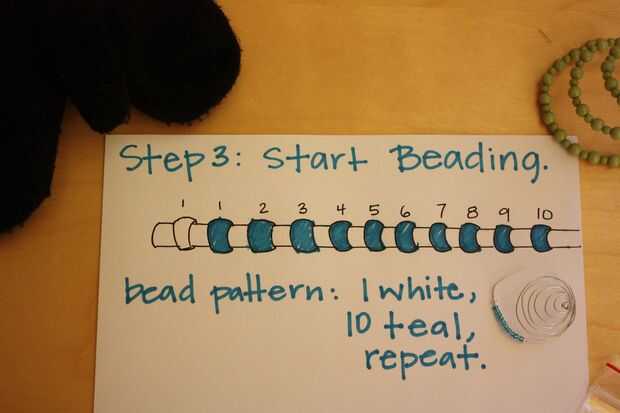 En este ejemplo, el patrón es 1 grano claro o blanco y 10 cuentas de turquesa, repetidas 17 veces.