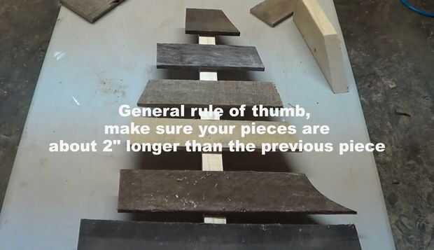 Una regla general, de arriba abajo, cada pieza debe ser aproximadamente de 2" de largo. Así que si la primera pieza es de 4" de ancho, el pedazo siguiente sería 6" ancho o ancha.