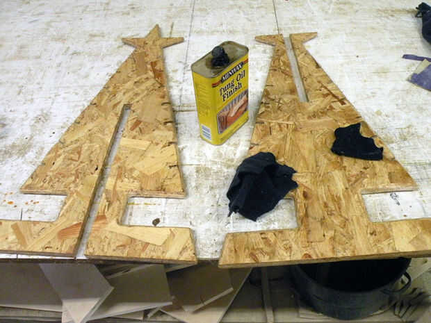 En este punto, puede muesca el árbol juntos, bofetada algunas luces en él y llamarlo hecho. Sin embargo, tomó un minuto o dos para ejecutar todos los bordes con un router y un poco roundover, como el OSB tiende a ser escamosa y splintery en los bordes. A continuación, lijar bien con lija de grano 100 y golpeó con una capa de aceite de tung. Cualquier tipo de poliuretano o mancha lo ayudará dura por próximos años.