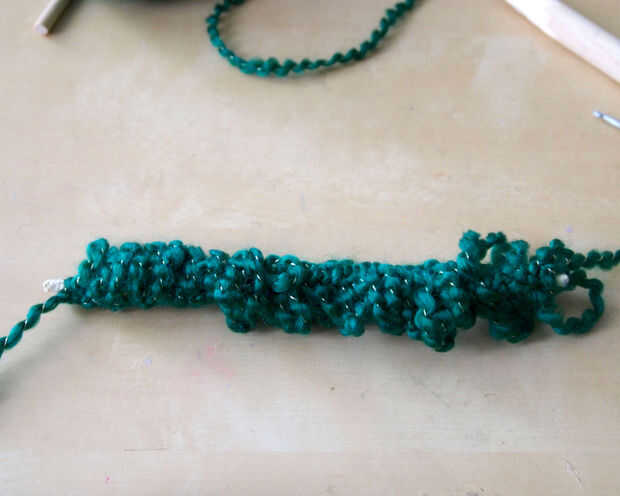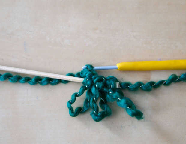 Una vez que termine de tejer las ramas podemos cortar los lazos para formar las agujas. Tire del lazo de la brocheta y cortado con tijeras, cada extremo debe ser del mismo tamaño. Seguir este camino a lo largo de la longitud de la rama y ahuecar los extremos cuando termines.