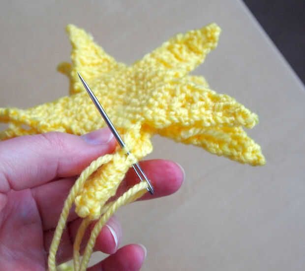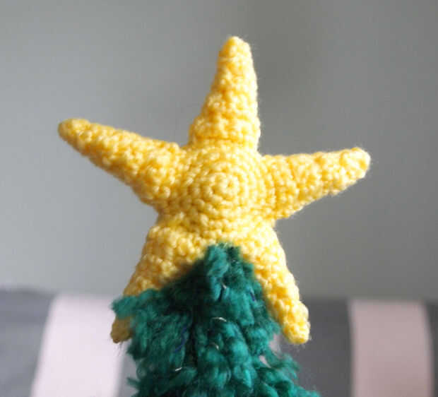 Hacer dos de estas estrellas y coserlas juntas a lo largo de los bordes, rellenar la estrella con fibrefil como vas. No coser el cierre, deje un pequeño espacio en la entrepierna de dos puntos. Inserte el extremo de la rama superior del árbol a través del agujero para usar la estrella como un adorno del árbol.