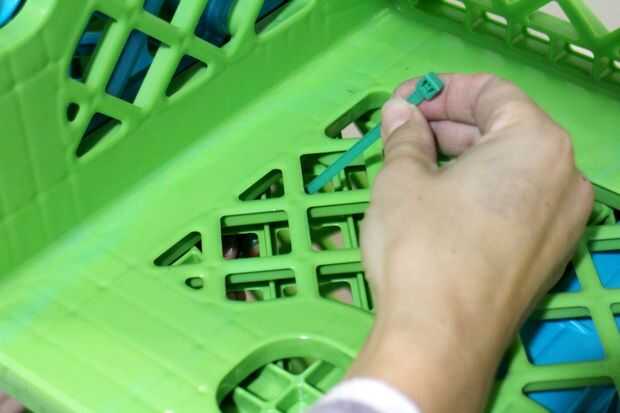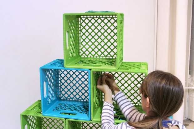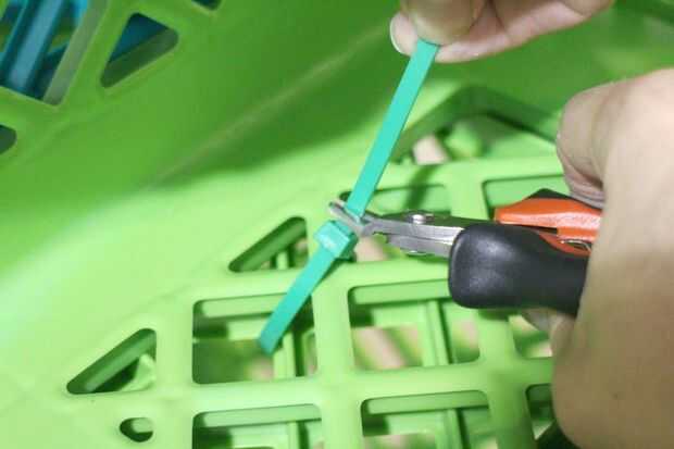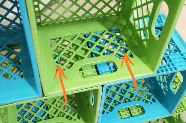 Hacer esto poniendo dos ataduras de cremallera a cada lado del piso de cada cajón apilado (no la parte inferior 4) y hacia abajo en la parte superior de los cajones abajo, como en la foto.