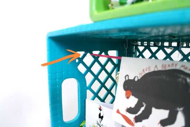 -asegurar larga gomas mediante ganchos de decoración en la parte superior dentro de algunos de los cajones para colgar tarjetas