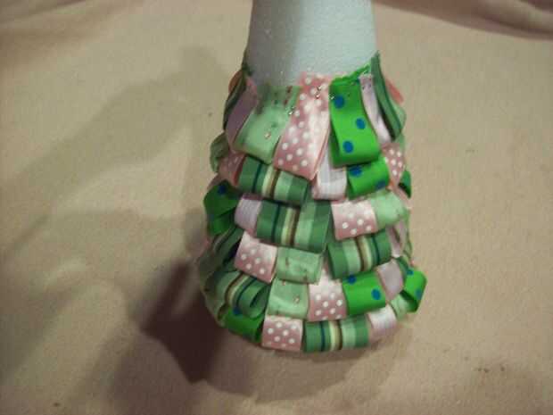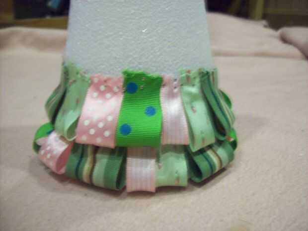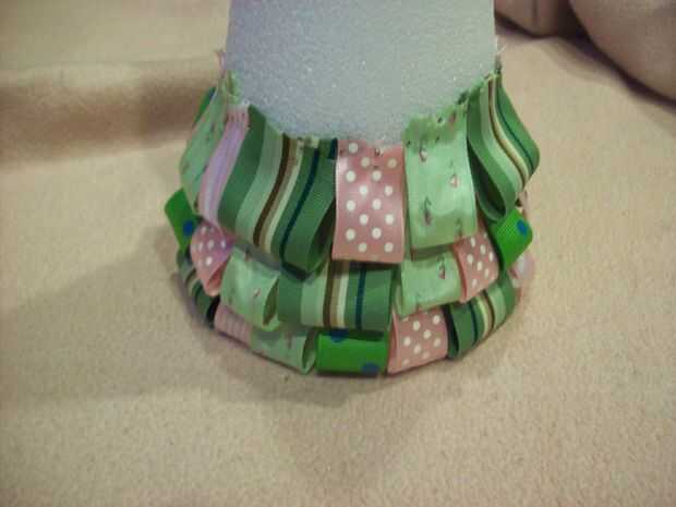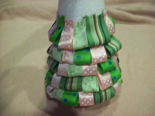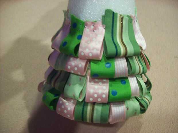 Después de que usted haya terminado con la primera capa, cubra los pernos de la primera capa con las cintas en la segunda capa como se ve en las fotos. Continúe este proceso hasta el cono entero.