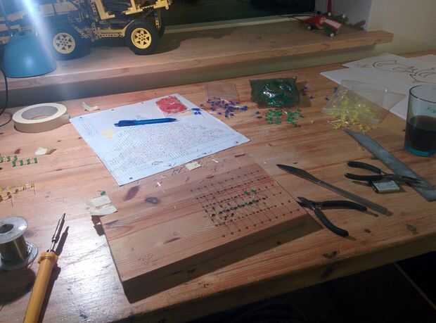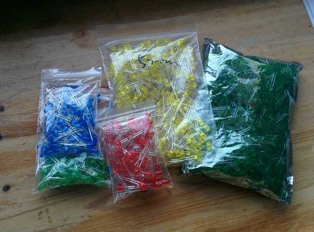 El gran truco aquí es encontrar intermitente LED. En ebay hay un montón de gente vendiendo estos. Todos mis LEDs verdes están constantemente, pero el amarillo y azul parpadean. Hice la asunción que no en el exacto mismo intervalo, causando un patrón al azar después de un tiempo, y no me equivoqué. En el principio flash todos juntos, pero después de 10-15 segundos es todo aleatorio. Si lo haces de esta manera, habrá sin programación, sin resistencias, sin condensadores, nada sino la serie de LEDs en un panel de fibra.