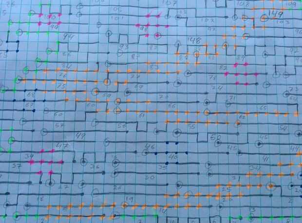 Usé mi patrón para poner puntos en un pedazo cuadrado de papel. Asegúrese de que obtener los colores asignados. A mano conecta cada punto en una serie de 7. Esto era muy tedioso, pero también un poco divertido, casi como solución de un rompecabezas. Tuve que recordarme que un par de veces, cuando me enteré 18,5 voltios aparecerá en la serie de 7 LEDs. Necesitaba 9 de una serie antes de que fuera capaz de manejar la tensión, así que tuve que volver a dibujar todo. Pieza de Consejo, prueba el LED antes de dibujar la serie. Comenzar con una serie de 10-12 LEDs y uno coger un tiempo, hasta que ve bien. Me hubiera ahorrado horas de trabajo.