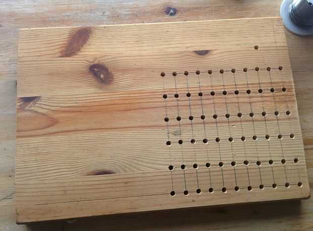 Para hacer la vida más fácil, hice una pequeña plantilla de soldadura. Utilizando las mismas dimensiones ha previsto para el montaje final, hizo una pequeña tabla con agujeros de 5mm espaciados uniformemente. No hay realmente ninguna magia para esto, simplemente mida donde perforar y poner unos agujeros en la madera. Puse los números en las filas y columnas, por lo que he podido encontrar las más adecuadas.