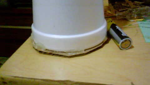 ahora, toma tu cartulina. Hágale un agujero pequeño en ella. Luego, corte un pedazo de percha y meterlo en ese agujero y asegurar con pegamento caliente. una vez fría, haga un orificio en la parte inferior de la taza. Deslice la taza sobre la pieza de gancho de alambre para que la parte superior pega el cartón. luego caliente encolarla.