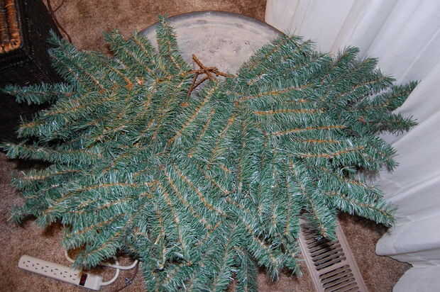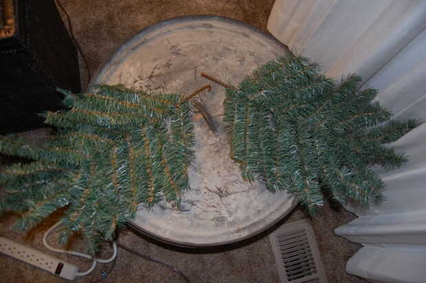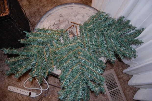 Comienza seleccionando las secciones más grande de la rama en el árbol de Navidad artificial y en la tapa de la olla. Intente colocar las ramas alrededor de la manija de la tapa para que los hornos apilar uniformemente y no se tambalean como esto puede ser muy peligroso si cae. Tenía una ventaja de no necesitar sucursales todo el camino alrededor del árbol puesto que estaba en una esquina de este año. Aunque en las fotos parece que el mango está cubierto por ramas, no es y el próximo horno se comprobó antes otros niveles eran apilados.